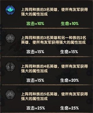 除了阵营克制,《剑与远征》还设有强大的羁绊机制。当上阵3名或以上同种族英雄时,全队将获得至少10%的攻击与生命加成,显著提升整体战力。