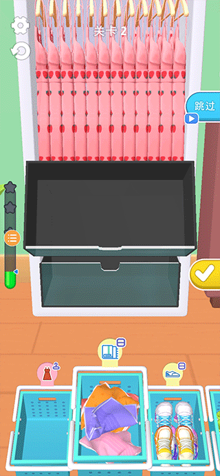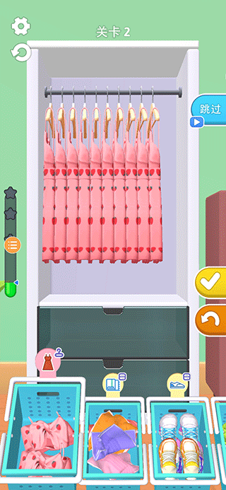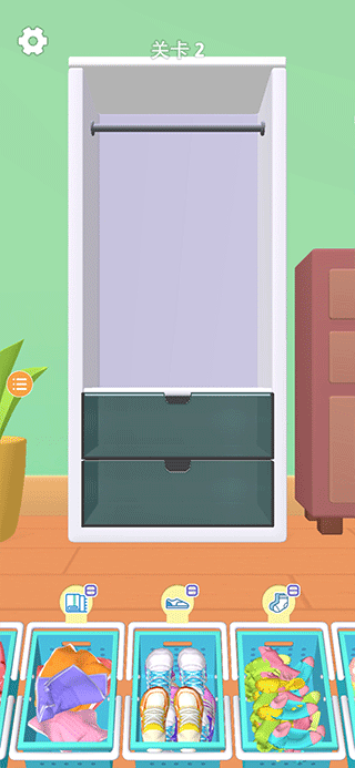 一、启动游戏后,屏幕下方会显示待整理的衣物,包括衣服、袜子、鞋子等,你需要将它们合理分配至衣柜的不同区域。