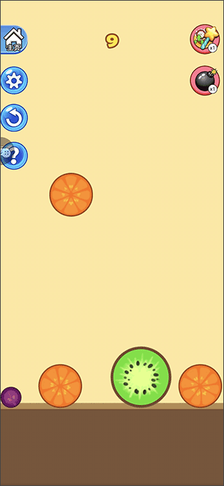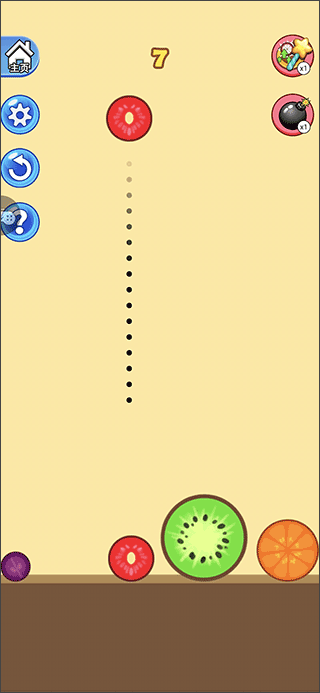 1. 游戏启动后,各类水果会从屏幕上方随机掉落,玩家需在它们落地前决定其下落位置;