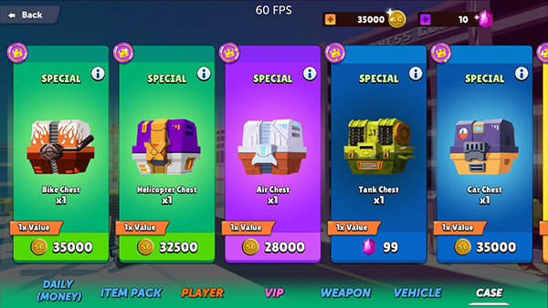选择左侧“Case”入口,可购买金币或钻石宝箱,内含武器、角色皮肤等稀有道具。
