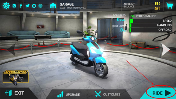 1、启动游戏后,点击主界面右下角的“RIDE”按钮进入骑行模式;