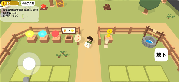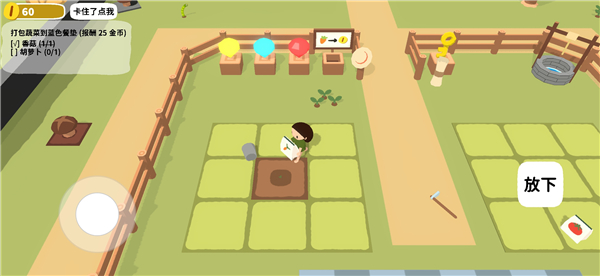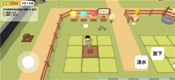 在黏脚菜园中文版中,完整还原了从选种到丰收的全过程。你需要购买种子、适时浇水,并利用场景中的水井取水。地图上还分布着蘑菇、胡萝卜、自行车等互动元素,完成各类任务后还能领取丰厚金币奖励!
