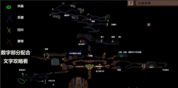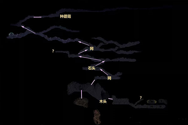 游戏初期建议先前往区域1,随后解锁需等待两小时才能开启的区域2大门。接着可进入区域3“永恒之间”,拾取关键道具并解锁床的制作配方。之后前往区域4激活水源,返回家中整理物品、绘制几幅画作,并继续探索周边区域。待门解锁后,前往区域5获取图纸。在区域6,站在倾斜的木柱顶端稍作停留,即可挖掘出硫磺(即黄色颜料),同时收集木材。随后前往顶部区域7采集水晶,并在区域8取得蓝色颜料,用其驱赶区域9的蜘蛛至另一侧织网;网成之后,便可抵达区域10的蘑菇地。蘑菇地分为紫色(10-1)与绿色(10-2)两种,若将二者共同种植于位置10-3,可使其融合生长为巨型蘑菇,再移栽至10-4。蘑菇地上方区域11有一段可挖掘的岩壁。耐心等待区域12的苔藓自然生长后即可采集。区域13右下角藏有一块木板,其余八块均位于顶部图纸获取点附近。注意:切勿急于使用单把镐子敲击区域14的宝藏石块,否则会将其破坏——至少需两把镐子方可安全挖掘,建议集齐三把后再行动(尽管该宝藏对主线影响不大)。游戏中三个结局均需抵达蘑菇地顶部方可触发,该区域上方连接着井口与塔楼结构。